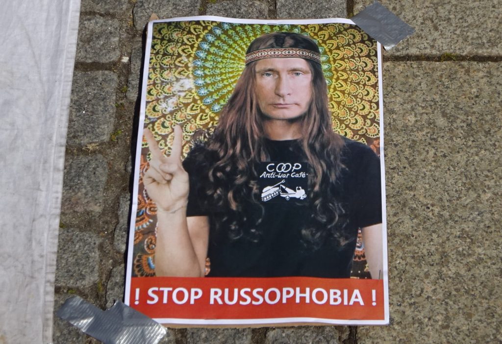 Eine Verurteilung des Angriffes sehe und höre ich nicht. Nach langem gezielten Suchen finde ich lediglich ein einziges (!) Schild, dass als Verurteilung Russlands durchgehen könnte: