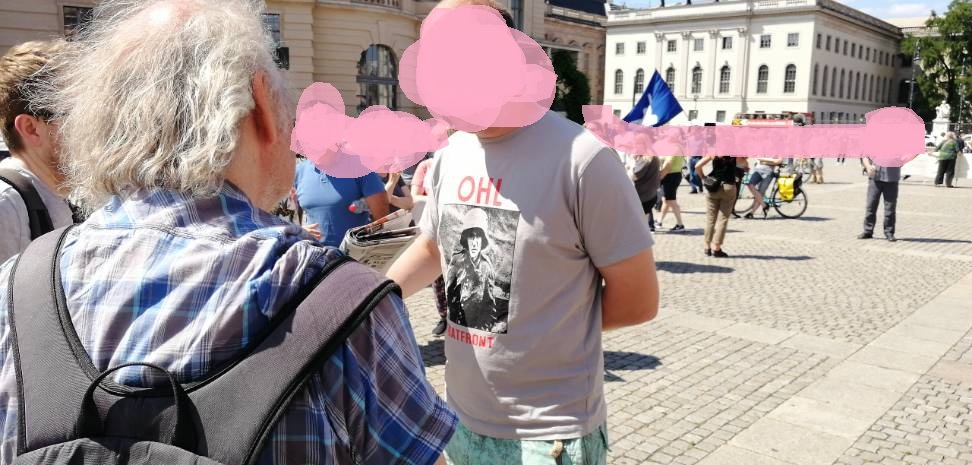 Dass das Fehlen von DIE BASIS und anderen Nazi-Schwurbeln nicht selbstverständlich ist, zeigen zwei Typen, die die Lage sondieren. Einer trägt ganz offen das T-Shirt einer Nazi-Band. Es hat sich rumgesprochen, dass man als Fascho auf Friedensdemos nichts zu befürchten hat.