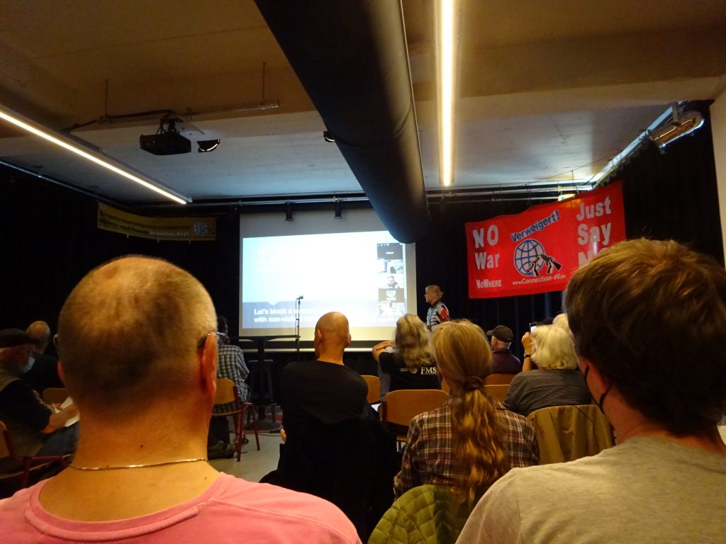 In der Eröffnungsveranstaltung redeten außerdem Mark Akkerman von Stop Wapenhandel, der die Rolle des Waffenhandels im Ukraine-Krieg vorstellte, und Christine Schweitzer vom Bund für soziale Verteidigung (BSV), die das Konzept der sozialen Verteidigung erklärte.