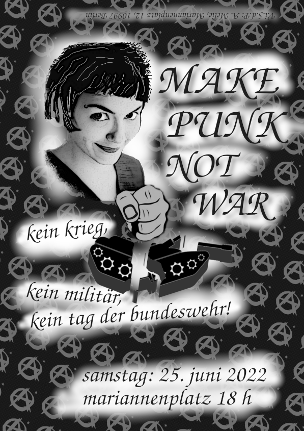 Wer hätte das gedacht: Die Antimilitaristische Aktion Berlin (amab) wird vier Jahre alt. Das wollen wir feiern mit einem Wochenend-Ausflug nach Frankfurt/Oder. Los geht’s am Freitag, den 5. August 2022 um 15h am Bahnhof Ostkreuz. Wir treffen uns auf Gleis 1 und fahren dann mit dem Regio 1 nach FFO. Wieder da sind wir am Sonntag, den 7. August gegen 18h.
