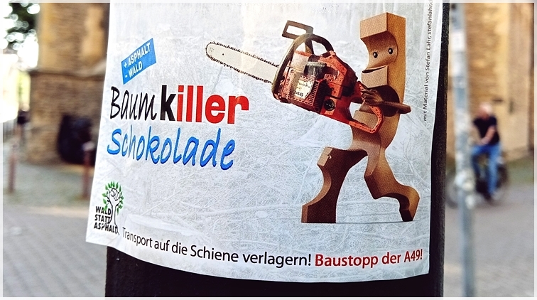 „Der Schokoladenhersteller Ferrero Rocher betreibt in Mittelhessen die weltgrößte Süßigkeiten-Fabrik und lässt von dort täglich bis zu 750 LKW durch die Region fahren. Der Konzern macht sich gleichzeitig stark für den Bau der Autobahn A49, für die eine breite Schneise durch den Dannenröder Wald und den Herrenwald geschlagen wird. Beide Wälder sind wertvolle Laubmischwälder, Heimat vieler Tier- und Pflanzenarten und Quell gesunden Trinkwassers für die Region, das Rhein-Main-Gebiet und bis nach Frankfurt/Main.“ (Zitat: bis-danni-ferrero)