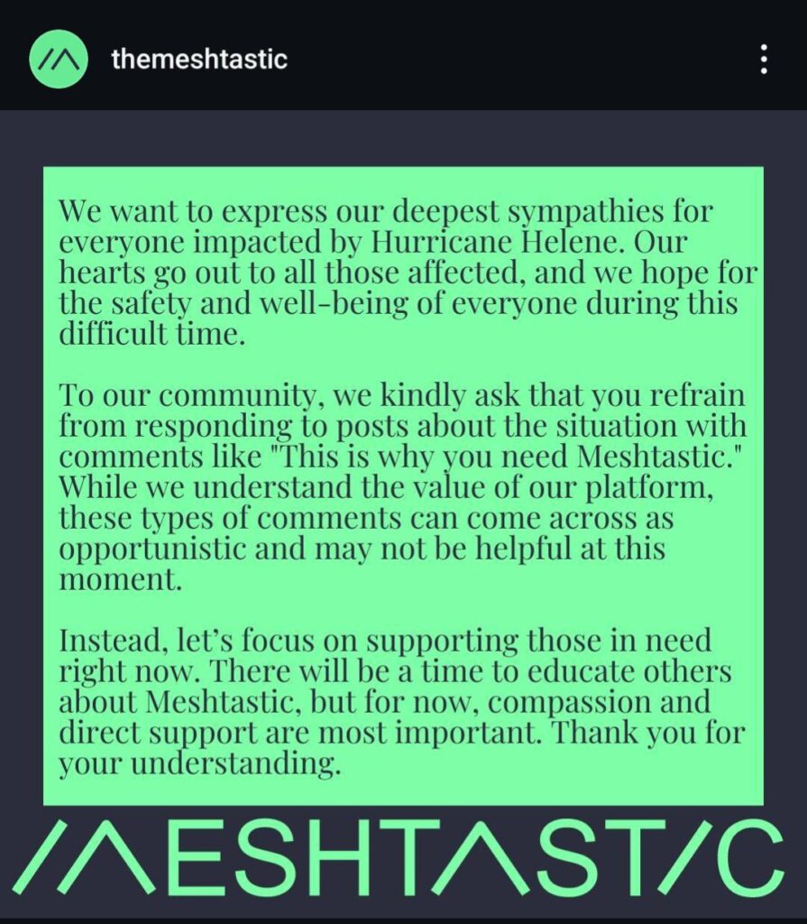 Screenshot of an Instagram post from Meshtastic. It says: We wish to express our deepest sympathies for everyone impacted by Hurricane Helene. Our hearts go out to all those affected , and we hope for the well-being of everyone during this difficult time. <br> To our community, we ask that you refrain from responding to posts about the situation with comments like “this is why you need Meshtastic.” While we understand the value of our platform, these types of comments can come across as opportunistic and may not be helpful at this moment. <br> Instead, let’s focus on supporting those in need right now. There will be a time to educate others about Meshtastic, but for now, compassion and direct support are most important. Thank you for your understanding. –Meshtastic