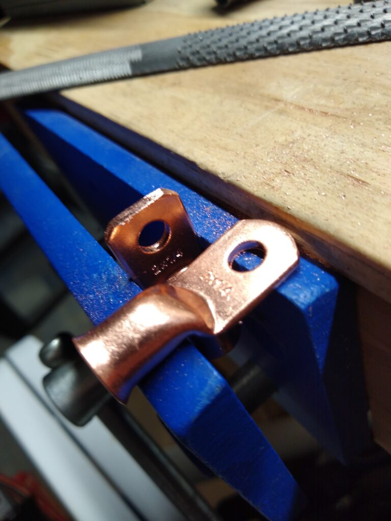 The 4 AWG ring terminals had to be filed down so that they would fit on the cutoff switch.