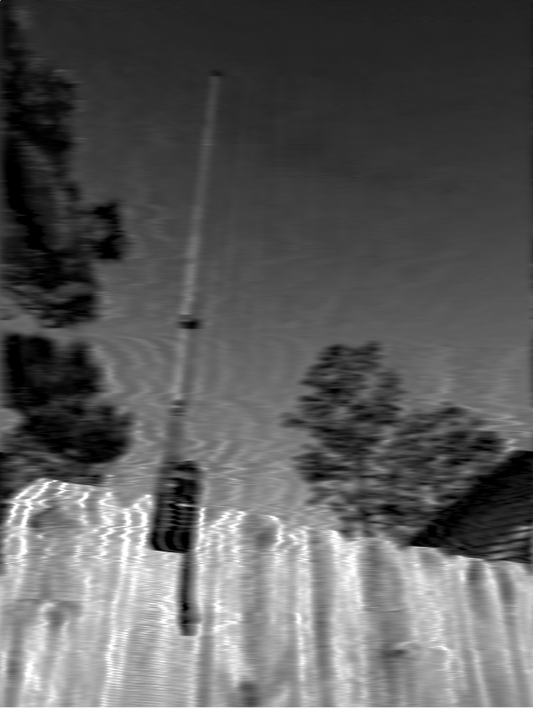 ID: BW SSTV mage distorted by Baofeng UV-5R clipped to the top of a wooden fence.