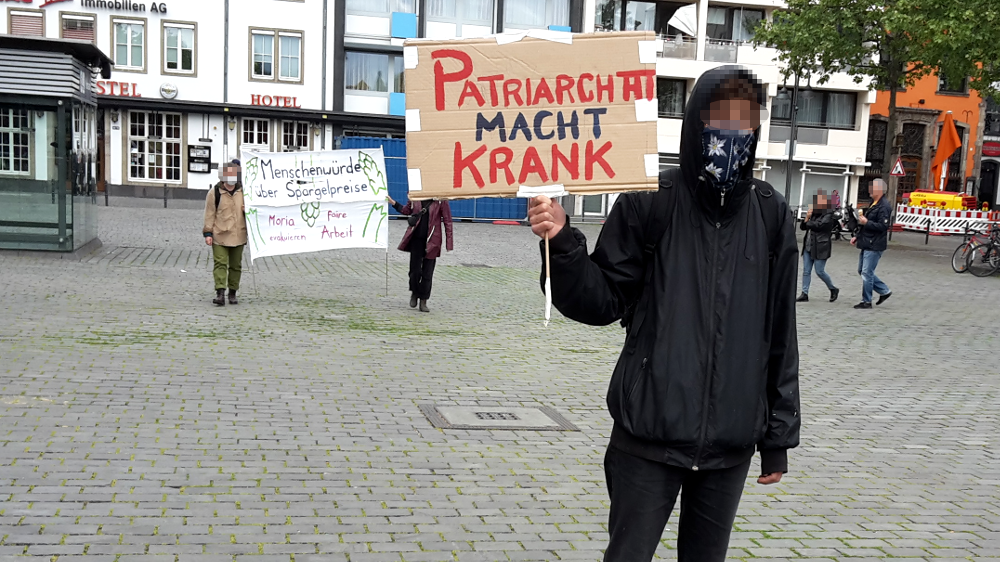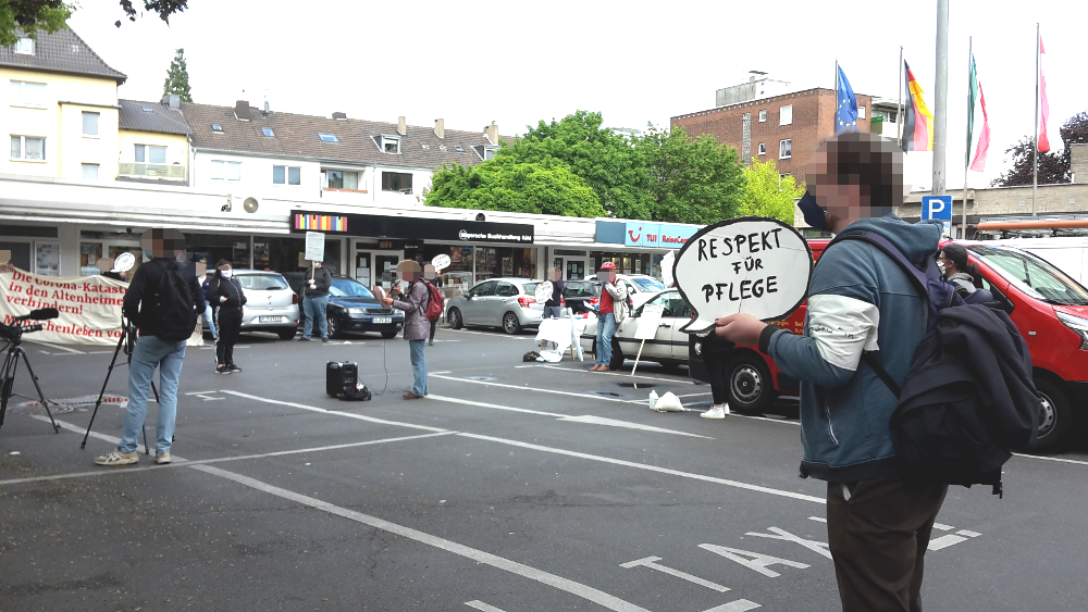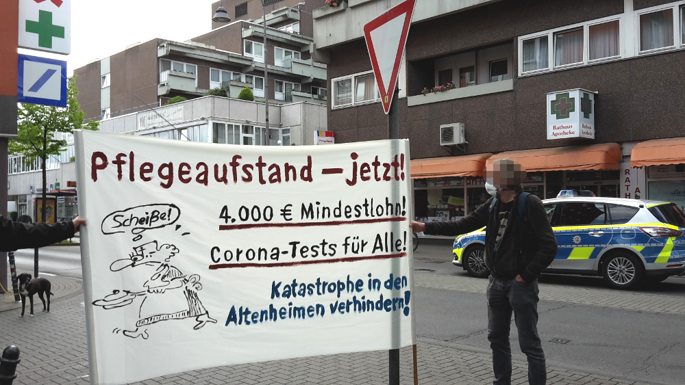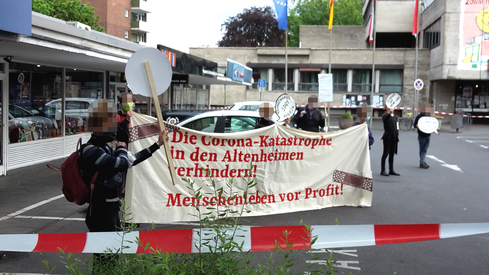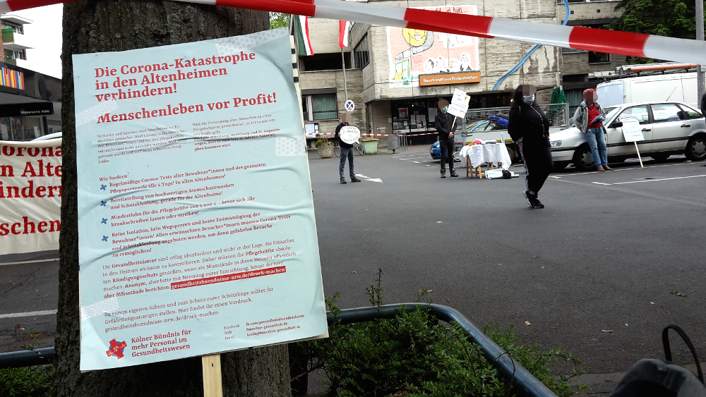 So fand im südlichen Vorort Rodenkirchen eine Kundgebung vor Bezirksrathaus statt, die auch auf die skandalösen Zustände in dem gegenüberliegenden Altenheim „Maternushaus“ der CURA-Unternehmensgruppe aufmerksam machte. Dort sind seit Ausbruch der Corona-Krise bisher 24 Menschen gestorben, weil sowohl Bewohner*innen, wie auch Pflegepersonal massenhaft infiziert wurden. Der millionenschwere Konzern hält sich mit öffentlichen Erklärung zu den auffälligen Infektionzahlen zurück, aber Mitarbeiter*innen berichten gegenüber den Medien von fehlender Schutzausrüstung und grassierender Angst.