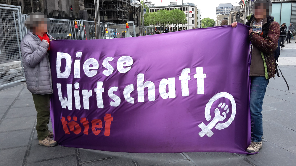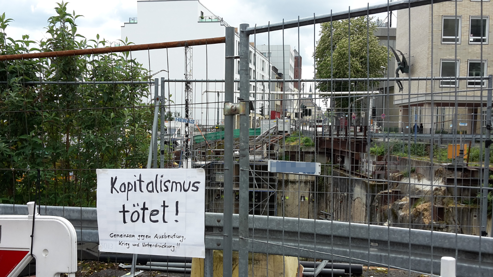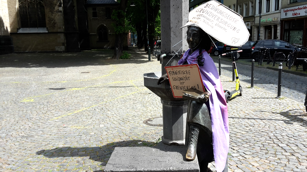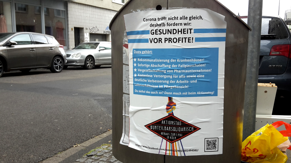 Neben dieser Versammlung von etwa 20 Teilnehmer*innen und ebensoviel Zuschauer*innen, fanden im Kölner Stadtgebiet auch mehrere andere Protestaktionen statt, z.B. vor der Uniklinik und am Roncalliplatz, aber auch in Kalk und Deutz. Auf dem Heumarkt, wo normalerweise die Abschlusskundgebung der Gewerkschaftsdemo stattfindet, versammelten sich etwa 50 Linke, überwiegend autoritäre Staatskommunist*innen. Hinzu gesellten sich etwa 20 rechte Corona-Leugner*innen aus esoterischen Verschwörungskreisen, die nur teilweise auf Ablehnung stießen.
