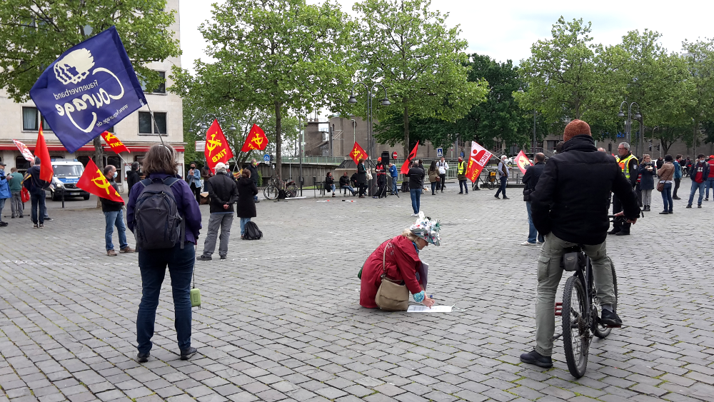 Da wegen der Covid19-Pandemie aus hygienischen Gründen keine DGB-Demo zum Internationalen Tag der Arbeiter*innen stattfinden konnte, hatte ein Bündnis verschiedener linker Gruppen und Organisationen unter dem Motto #UnteilbarSolidarisch dezentrale Kundgebungen angemeldet. Zwar wurden nicht alle von der Staatsmacht genehmigt, aber einige Versammlungen konnten im begrenzten Rahmen mit Maskenpflicht unter Einhaltung von Mindestabstand stattfinden.