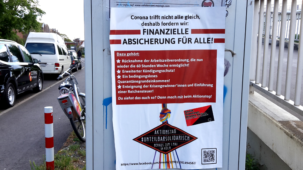 An diesem dezentalen Aktionstag fanden auch in anderen Stadtteilen Kölns kleine, spontane Aktionen statt. Es wurden Parolen auf Straßen gemalt und Banner gezeigt, Schilder gemalt, Musik gemacht und vieles mehr. Auch wenn der Anlass für diese ungewöhnlichen Protestformen eine dramatische Pandemie mit weltweit Millionen Erkrankten und Hunderttausenden Toten ist, so könnte man erwägen, ob das traditionelle Gedenken an die Justizopfer des historischen Ersten Mai 1886 mit all den langweiligen Festtagsreden bezahler Gewerkschaftsfunktionäre und staatstragender Politiker*innen wirklich noch angemessen ist. Oder ob heute die Zeit gekommen ist, für einen kreativen Neubeginn sozialer Protestformen und selbstorganisierter Arbeitskämpfe – jenseits digitaler Vernetzung, auch in der realen Welt.