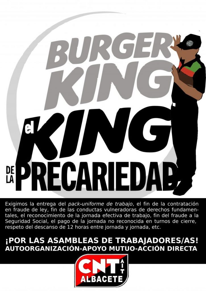 Die „Vereinigung verschiedener Berufe“ der Basisgewerkschaft CNT-IAA in Albacete veranstaltet eine landesweite Aktionswoche gegen „Burger King“ vom 02.-08. August 2021. Anlass ist die systematische Verletzung von Rechten der Belegschaft durch das Fast-Food-Unternehmen.