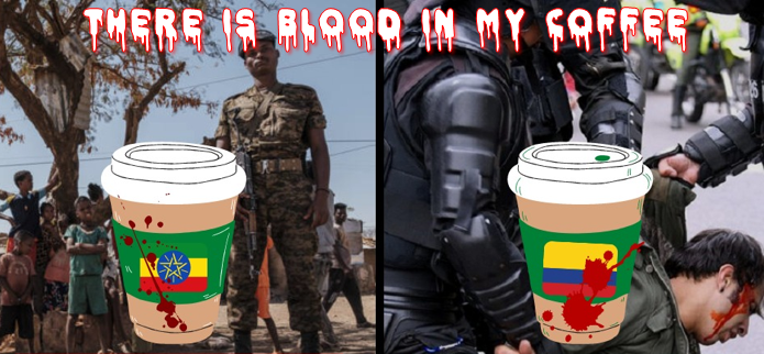 Mit dem Kauf von Kaffee aus Kolumbien oder Äthiopien (auch von sogenannten „Kleinbäuer*innen“) werden diese beiden Staaten finanziert, die ihre Bevölkerung massakrieren, welche mehr Freiheit und soziale Gerechtigkeit fordert.