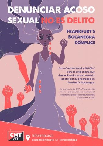 Ende Juni fand vor dem Würstchen-Lokal Frankfurt’s Bocanegra in der andalusischen Stadt Granada erneut eine Kundgebung der CNT-IAA statt, um gegen die sexuelle Belästigung einer Genossin zu protestieren, welche diese gemeinsam mit dem Syndikat öffentlich anprangert.