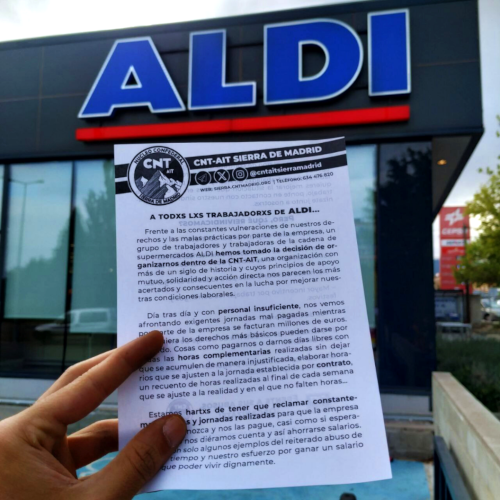 Die CNT-IAA Sierra de Madrid hat bei der Aktion alle ALDI-Mitarbeiter*innen angesprochen, die sie antrafen, und hat ihre Flugblätter in den Betrieben ausgehängt. Alles verlief ohne Zwischenfälle und die Reaktionen der Arbeiter*innen waren positiv, was auch bereits zu neuen Kontakten geführt hat.