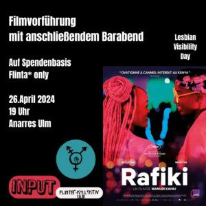 Am 26.04.24 schauen wir gemeinsam den Film Rafiki (2018, Reg. Wanuri Kahiu), ein Drama aus Kenia über eine (Liebes)beziehung zwischen zwei Frauen. CW: Der Film ist lebens- und liebebejahend, jedoch kommen darin Szenen erheblicher homophober und christlich-religöser Gewalt vor. Der Film geht insgesamt 83 Minuten. Der Film wird auf Englisch mit Englischen Untertiteln sein. Danach wollen wir, wenn ihr wollt, gemeinsam über den Film reden. Anschließend folgt ein FLINTA* Tresen. Ihr dürft natürlich auch gerne nur zum Tresen kommen. Wir freuen uns auf euch!