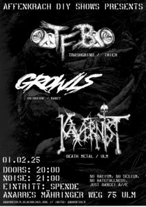 Affenkrach Konzert 01.02.25 • Affenkrach DIY Shows presents • 💥 T.F.B. (Thrashgrind, Trier) 💥Growls (Grindcore, Nancy) 💥Kavernist (Death Metal, Ulm) Doors: 8pm / 20:00 Noise: 9pm / 21:00 Entrance: Donation