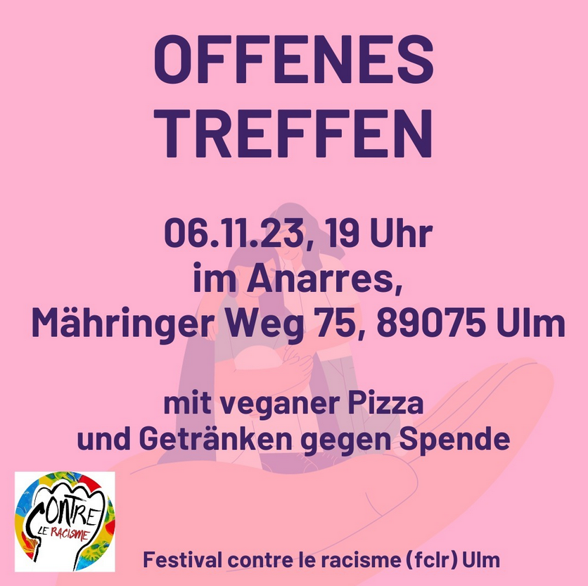 Das Festival Contre Le Racisme Ulm (FCLR) ist zu Gast im Anarres und organisiert ein offenes Treffen. Wenn dich das FCLR interessiert komm vorbei.