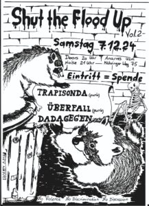 Das Hochwasser im Juni hat den Falkenkeller ordentlich den Sommer versaut. Die Räume sind seit Anfang Juni leer und feucht. Deshalb freuen wir uns umso mehr, dass zwei der im Falkenkeller geplanten Konzerte, unter dem Motto „Shut the Flood up“, jetzt im Anarres stattfinden können. Fettes Danke dafür.