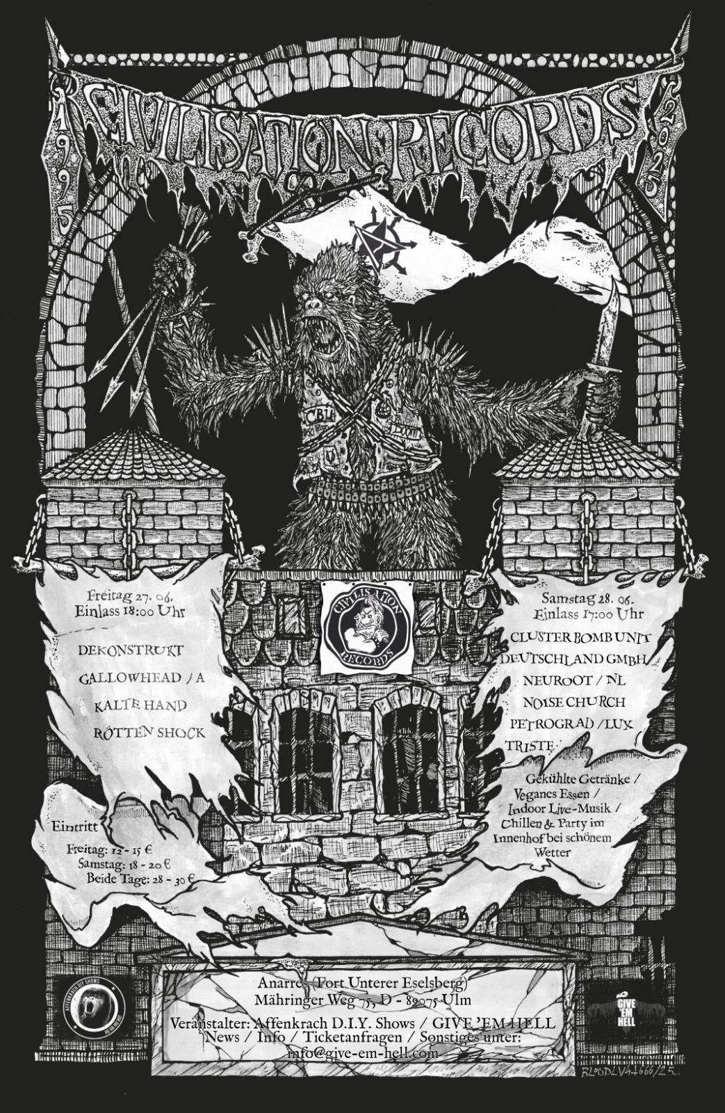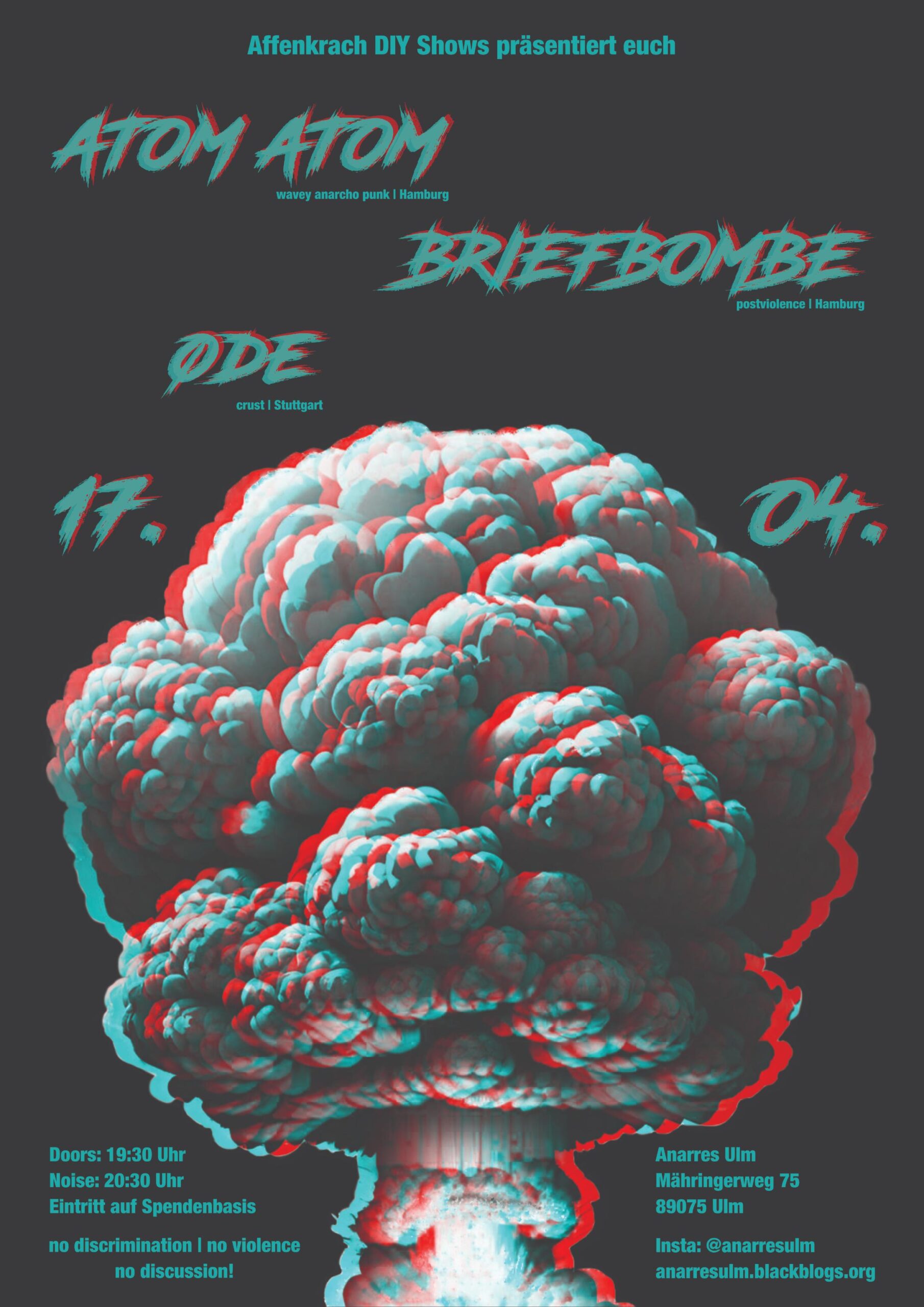 💥 Atom Atom (Wavey Anarcho Punk /Hamburg) 💥 Briefbombe (Postviolence/Hamburg) 💥 ØDE (Crust/Stuttgart) DOORS: 7:30pm / 19:30 No discrimination / no violence / no discussion Spenden Empfehlung / Donation recomandation: Freitag 27.06: 💥 Dekonstrukt (Crust Punk / Ulm) 💥 Gallowhead (Metal/ Feldkirch) 💥 Kalte Hand (Gloomy Post-Punk / Augsburg) 💥 Rötten Shock (Anarkopunk / München) Samstag 28.06.: 💥 Cluster Bomb Unit (Hardecore Punk / Stuttgart) 💥 Neuroot (EU HC Punk / Netherlands) 💥 Noise Church (Post Punk / Ulm) 💥 Petrograd (Luxemburg) 💥 Triste (aggressive Death / Doom / Stuttgart)