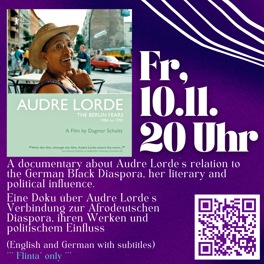 Eine Doku über Audre Lordes Verbindung zur Afrodeutschen Diaspora, ihren Werken und politischen Einflüssen. Im Anschluss FLINTA* Tresen (Film in englisch mit deutschen Untertiteln). Dieser Film ist Teil einer Veranstaltungsreihe - Das Flinta* Kollektiv startet in den Herbst mit einer intersektionalen feministischen Filmreihe. Denn was passt besser als sich in den dunkleren, kälteren Tagen gemeinsam Filme anzuschauen und darüber zu sprechen. Sie haben einen bunten Mix an Filmen ausgewählt, die sowohl an Genre, Inhalten und Stil unterschiedlich sind und wollen so verschiedene Perspektiven sichtbar machen. Bei Fragen kommt jederzeit gerne auf das Flinta* Kollektiv zu. This film is part of a series of events - The Flinta* Collective starts into the fall with intersectional feminist film screenings. After all, what is more fitting than watching and talking about films together during the darker, colder days? They have selected a diverse mix of films that are different in genre, content, and style, and aim to make different perspectives visible. If you have any questions, please feel free to contact the Flinta* collective.