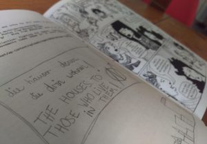 In the Zine we are met with the characters Esther, Mo and Riz, 3 people whos fates are tied together by a common place – the self organized project house and wagon platz Alte Schule that is threatened with eviction. Alte Schule is a fictional project, but it might as well have been real as many self organized places in Berlin and everywhere right now face evictions and are struggling to stay alive. Angry Ink stand in solidarity with all the projects here and everywhere, fighting for self-organized_left_anarchist_queer_safe_non-commercial spaces to stay alive and thriving.