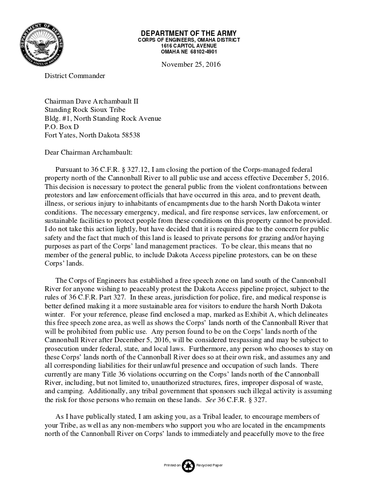“As I have publically [sic] stated, I am asking you, as a Tribal leader, to encourage members of your Tribe, as well as any non-members who support you who are located in the encampments north of the Cannonball River on Corps’ lands to immediately and peacefully move to the free speech zone south of the Cannonball River or to a more sustainable location for the winter. I am genuinely concerned for the safety and well-being of both the members of your Tribe and the general public located at these encampments.” – Colonel John Henderson