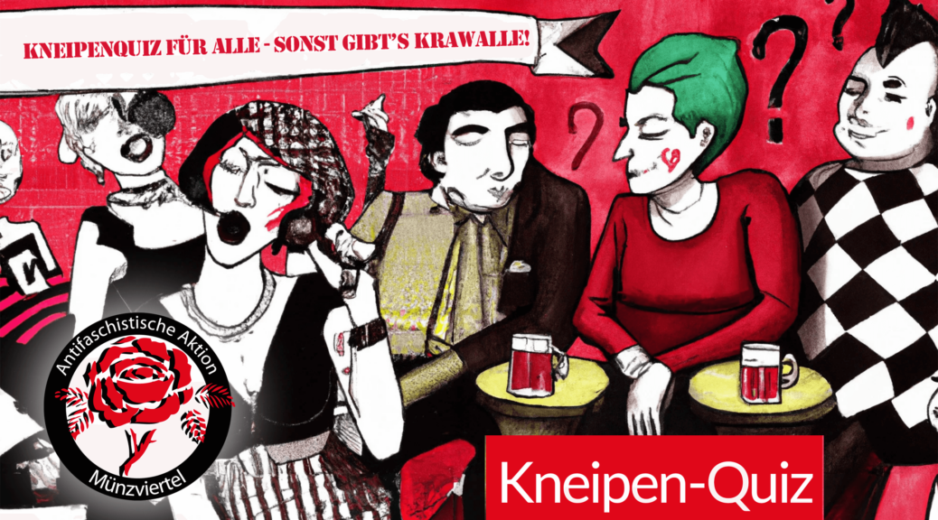 Die Antifaschistische Aktion Münzviertel lädt euch herzlich ein, zu Kneipe und Antifa-Quiz inklusive Überraschungspreis, Getränken gegen Spende und antifaschistischem Programm für die Ohren. Bringt eure Freund*innen mit, bildet eine 4er Quiz-Bande und lasst uns gemeinsam eine solidarische und offene Atmosphäre schaffen. Wir freuen uns auf euch!