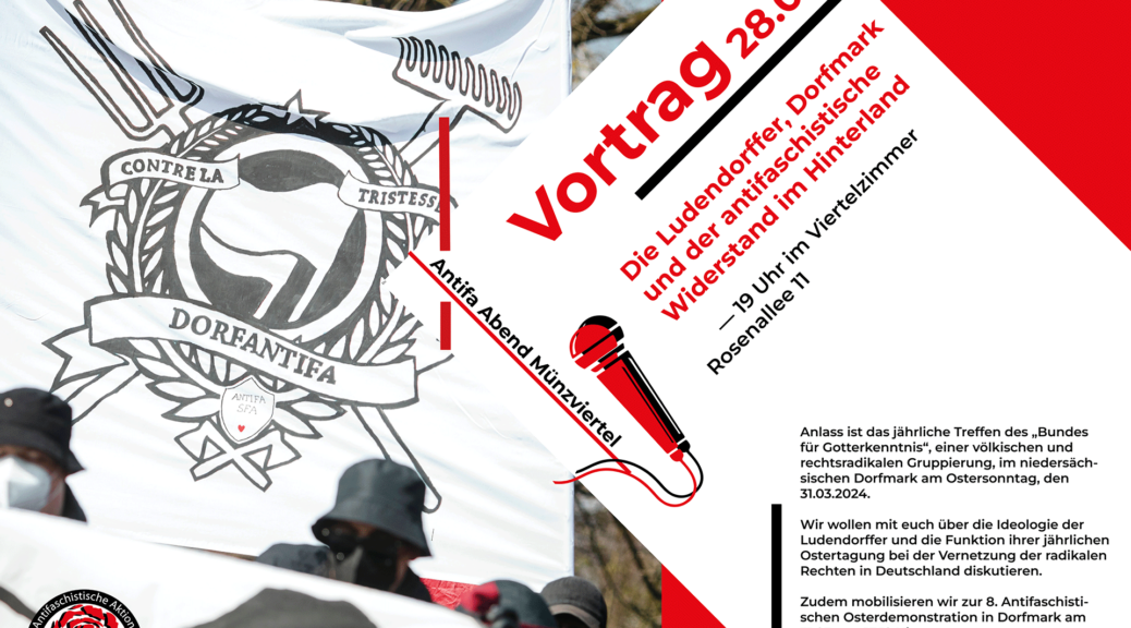Wir wollen mit euch über die Ideologie der Ludendorffer und die Funktion ihrer jährlichen Ostertagung bei der Vernetzung der radikalen Rechten in Deutschland diskutieren. Zudem mobilisieren wir zur 8. Antifaschistischen Osterdemonstration in Dorfmark am 31.03. um 13:12 Uhr