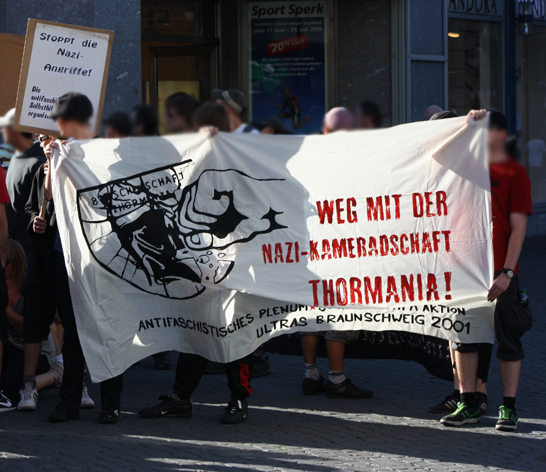 Die Mitglieder der Nazikameradschaft „Thormania“ fallen „in der jüngsten Zeit durch rege Aktivitäten auf und gehören zu einem rechtsextremen Netzwerk, das sich von Braunschweig über Wolfsburg bis nach Südniedersachsen erstreckt“ (www.npd-blog.info). Sie beteiligen sich an Aufmärschen, fahren zu Rechtsrock-Konzerten und verbreiten Propagandazettel und Aufkleber. Sie organisieren Fußballturniere und laden zu Kameradschafts- und „Liederabenden“ ein. Im Januar letzten Jahres durchsuchte die Polizei im Rahmen einer Razzia gegen Nazis aus ganz Südniedersachsen auch drei Wohnungen in Braunschweig-Querum. Hier wohnen die Brüder Sören, Sebastian und Christian Högel – alle drei Aktivisten der „Thormania“. Gefunden wurden u.a. „ein Karabiner, ein waffenscheinpflichtiger Dolch sowie viele Nazi-Erinnerungsstücke und