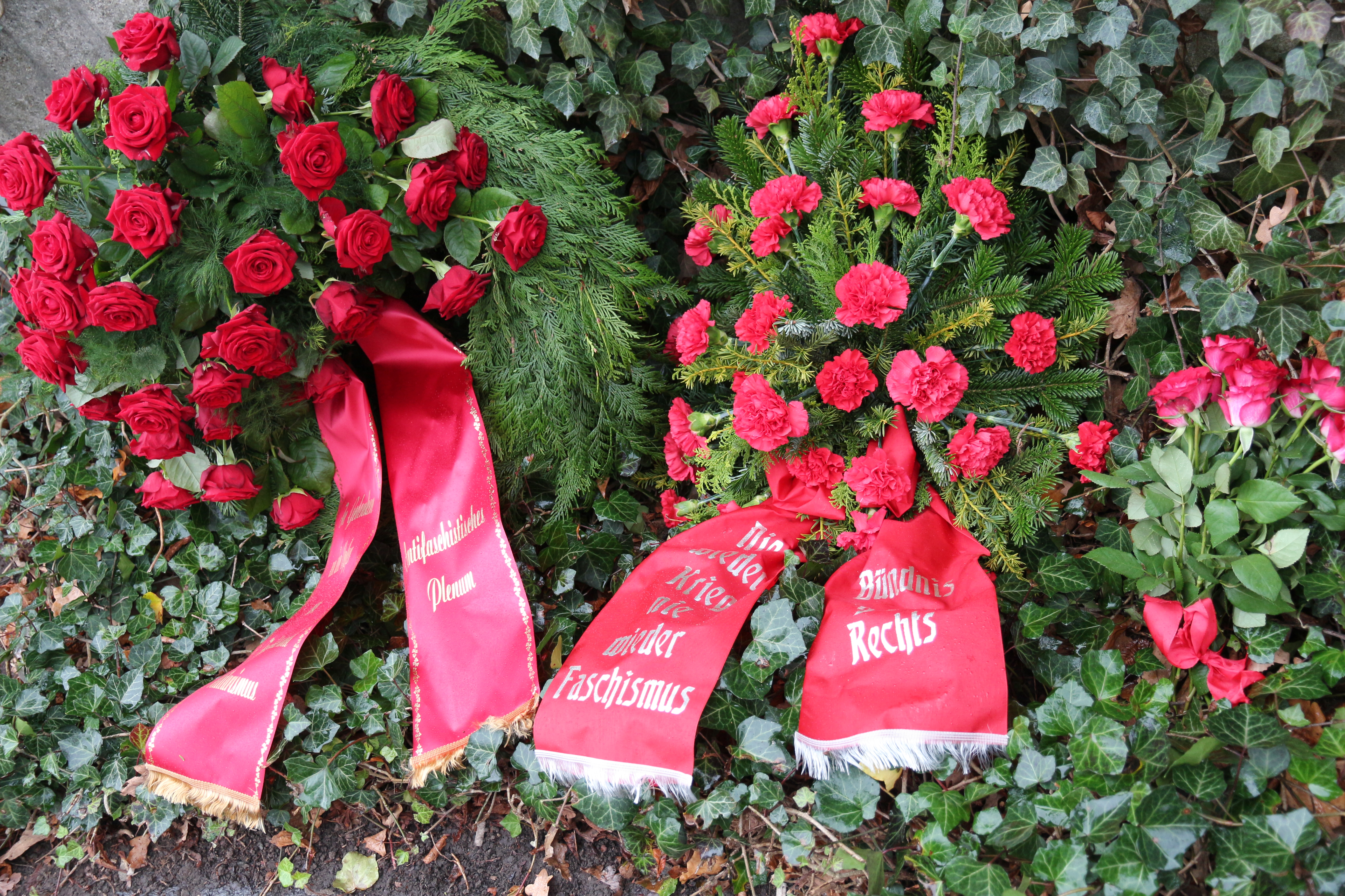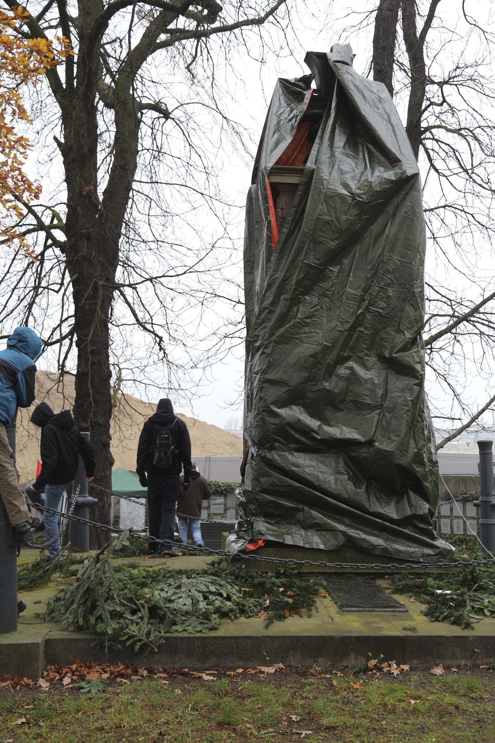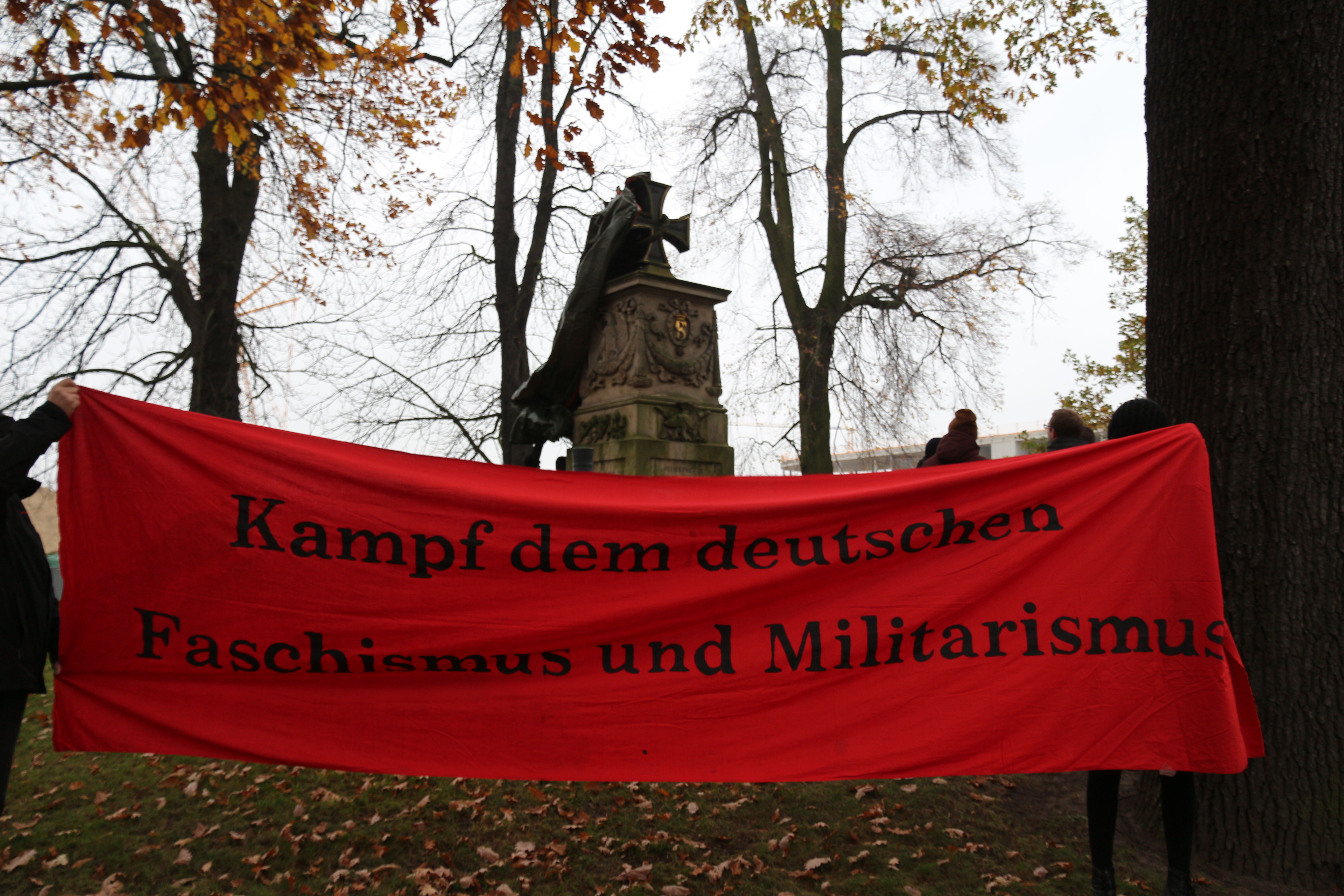 Am 16.11.2014 fand unserer Kundgebung in Gedenken an die Opfer von Faschismus und Militarismus statt. Trotz des regenerischen Wetters nahmen 50 Personen an der Aktion teil. Weil wir unsere Kundgebung nicht im Schatten des militaristischen Schilldenkmals abhalten wollten, wurde es zu Beginn der Veranstaltung vollständig verhüllt. Im Anschluss an das Gedenken konnte noch die Austellung zur Entstehung der Gedenkstätte Schillstraße besucht werden.
