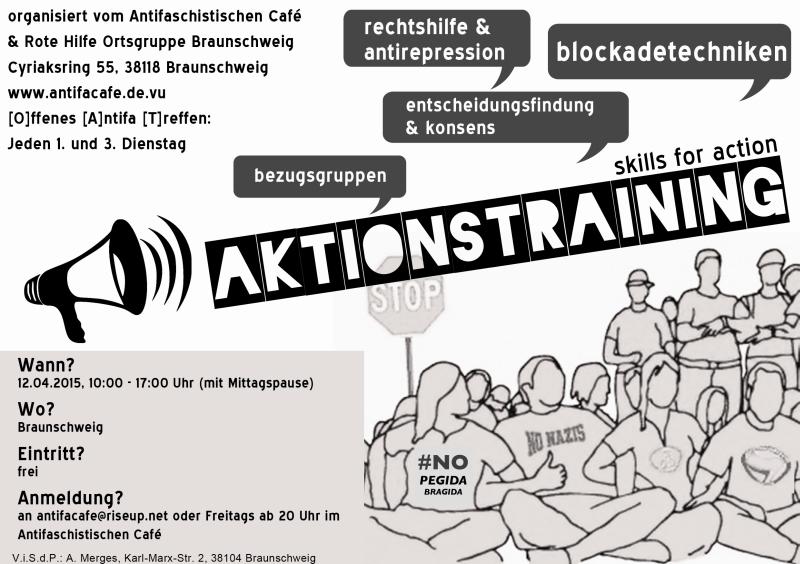 Am Sonntag, den 12.04. laden wir zum Aktionstraining ein! Ein Mensch von „skills for action“ wird uns über Tipps und Tricks für Blockaden informieren – welche wir dann auch gleich in der Praxis ausprobieren werden! Natürlich gibt es begleitend dazu ausführliche Rechtshilfetipps!