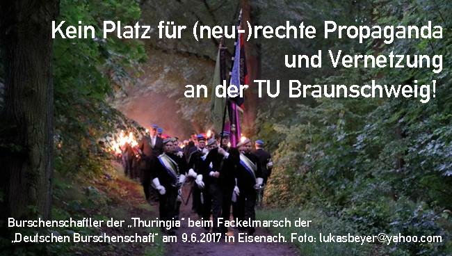 Das Bündnis gegen Rechts ruft für Samstag, den 1.7.2017, zu einer Kundgebung unter dem Motto „Kein Platz für (neu-)rechte Propaganda und Vernetzung an der TU Braunschweig“ vor dem Haus der Braunschweiger „Burschenschaft Thuringia“ auf. Die Burschenschaft veranstaltet an diesem Tag ein „Deutschland-Seminar“, bei dem ausschließlich Künstler und Referenten angekündigt sind, die zum Spektrum der extremen Rechten gehören und (neu-)rechte Strategien und Konzepte propagieren.