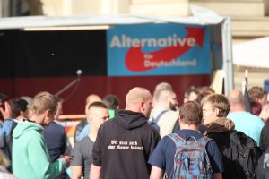 Bei der AfD-Wahlveranstaltung im August 2016 verließen ein paar Nazis, unter ihnen Timo Steinmann und Tobias Weiß, die laufende Veranstaltung, um sich Biernachschub zu holen. Auf dem Rückweg drängten sie sich dann gezielt durch die Gegendemonstrant*innen und provozierten diese. Wieder bei der AfD-Veranstaltung angekommen, liefen die beiden sofort zur Polizei, um sich darüber zu beschweren geschubst worden zu sein. Timo Steinmann nutzte die Gelegenheit und stellte eine Anzeige gegen einen Antifaschisten.