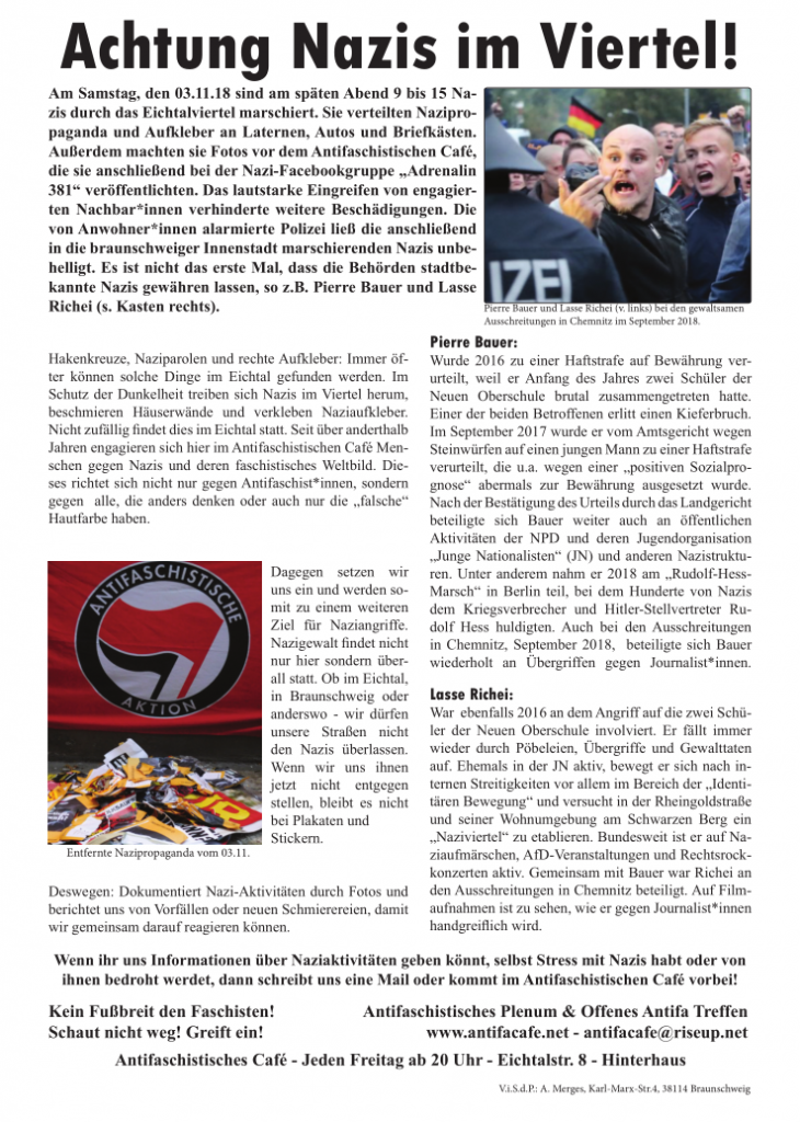 Wenn ihr uns Informationen über Naziaktivitäten geben könnt, selbst Stress mit Nazis habt oder von ihnen bedroht werdet, dann schreibt uns eine Mail oder kommt im Antifaschistischen Café vorbei!