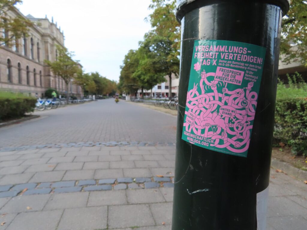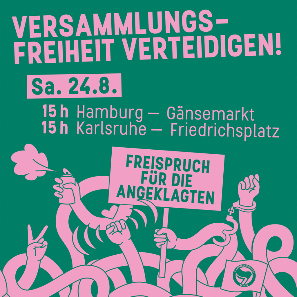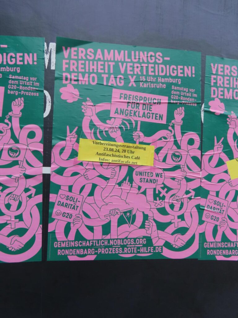 Die Kampagne Gemeinschaftlicher Widerstand ruft unter dem Motto „Versammlungsfreiheit verteidigen! Freispruch für die Angeklagten im G20-Rondenbarg-Prozess!“ für Samstag, den 24. August, zu Demonstrationen in Hamburg und Karlsruhe auf. Wir zeigen uns ebenfalls solidarisch mit den betroffenen Genoss*innen, stellen uns gegen Repressionen und schließen uns somit der Demonstration an.