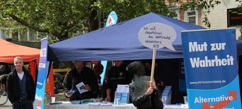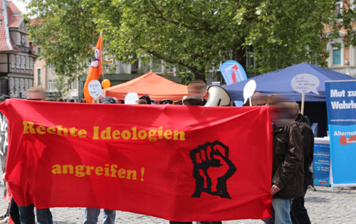 Heute Mittag demonstrierten rund 15 AntifaschistInnen gegen einen Stand der rechtspopulistischen AfD auf dem Kohlmarkt. Sie entrollten zwei Transparente, verlassen mehrmals einen Redebeitrag und verteilten Flugblätter (hier als (PDF)