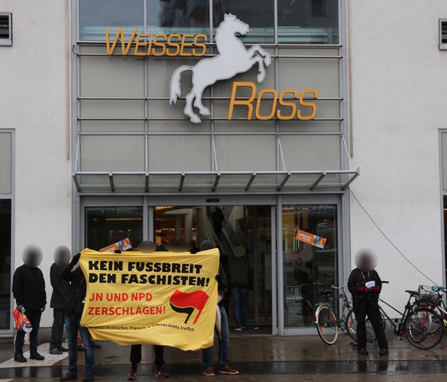 In den letzten Wochen haben Aktivisten der NPD-Jugendorganisation „Junge Nationaldemokraten“ (JN) wiederholt vor dem Einkaufscenter „Weißes Ross“ Propagandaflugblätter verteilt. Am Donnerstag (21.1.2016) wurde eine Person, die gerade einkaufen wollte, von den verteilenden Nazis bedroht, geschubst und durch das Einkaufscenter verfolgt, nachdem sie eines der rassistischen Flugblätter zerrissen hatte. Bisher hat weder das Management des Einkaufscenters, noch der dort tätige Sicherheitsdienst, noch die Polizei offensichtlich etwas gegen die dort regelmäßig verteilenden Nazis unternommen. Und obwohl ein Security-Mitarbeiter die Attacke beobachtet hatte, griff er nicht ein. Continue reading Protestaktion vor dem Einkaufscenter „Weisses Ross“