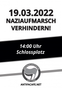 Am Samstag, den 19.03. rufen die Nazis der faschistischen Kleinstpartei „Die Rechte“ abermals zu einer Kundgebung auf. Ab 14:30 Uhr versuchen sie dieses Mal auf dem Schlossplatz das Thema Ukraine-Krieg für ihre Zwecke zu vereinnahmen.
