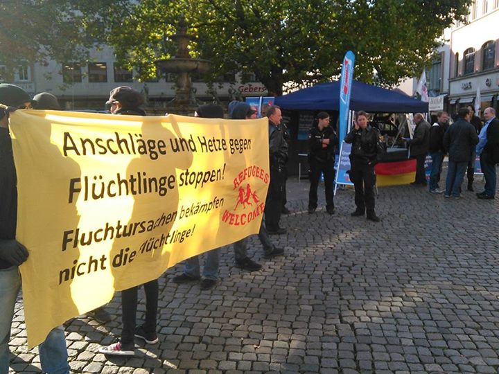 Am Samstag, den 10.10.15 hatte die AfD-Braunschweig einen Infostand auf dem Kohlmarkt aufgebaut und versuchte ihre rassistische Hetzte unter die Leute zu bringen. Spontan versammelten sich ca. 20 Antifaschist*innen, welche immer wieder von Passant*innen bei der Aktion gegen di10276003_1058485604184778_1644499387714603015_ne AfD unterstützt wurden. Nachdem erst direkt vor dem AfD-Stand protestiert wurde, meinte die extra angerückte Polizei, die Demonstrant*innen ein paar Meter neben den Stand schieben zu müssen. Dennoch konnte deutlich gemacht werden, dass hier versucht wird rassistische Positionen zu verbreiten. Mehrmals wurde den Protestierenden Kaffee gebracht und weitere Passant*innen solidarisierten sich!