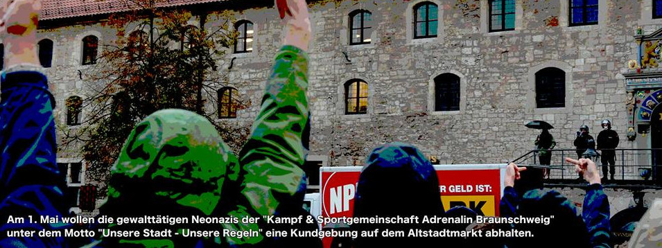 Am 1. Mai wollen die Nazis der selbsternannten „Kampf- & Sportgemeinschaft Adrenalin Braunschweig“ um 13 Uhr eine Kundgebung abhalten. Die Gruppe, die bezeichnenderweise als Symbol einen Schlagring benutzt, mobilisiert unter dem Motto „Unsere Stadt – Unsere Regeln“ zum „Tag der deutschen Arbeit“ auf den Altstadtmarkt.