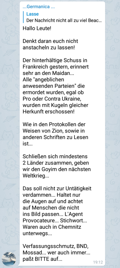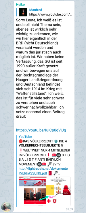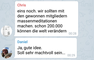 Auch inhaltlich lassen sich im Gruppenchat Massen an verschwörungsideologischen Inhalten und denen der sogenannten „Reichsbürger“ finden. Unter diesen Postings befinden sich auch unverhohlen antisemitische Beiträge. Diese Inhalte wurden teilweise so exzessiv gepostet, dass darum gebeten wurde, eine eigene Gruppe für derlei Themen zu gründen. Nicht weil man mit dem Thema nicht einverstanden sei, sondern weil man in der bestehenden Gruppe nur Organisatorisches besprechen wolle. Stellenweise wird es in der Gruppe skurril, besonders wenn vorgeschlagen wird, Massenmeditationen durchzuführen, was ein anderes Mitglied als „gute Idee“ und „machtvoll“ bezeichnet.