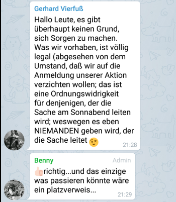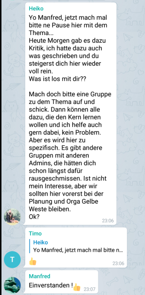 Inwieweit der Aktionismus der „gelben Westen“ nachhaltig sein wird, bleibt abzuwarten. Die Teilnehmer*innenzahlen der ersten Aktionen blieben überschaubar und das eine oder andere Mitglied wird sicherlich Enttäuschungen erfahren, wenn sich die groß angekündigten Revolutionspläne in Wohlgefallen auflösen. In der Chatgruppe sind bereits enttäuschte Töne über die geringe Beteiligung an den Aktonen zu vernehmen. Protagonisten wie Dirk Palm haben die Gruppe bereits verlassen oder beteiligen sich nicht mehr aktiv an den Diskussionen. Auch Gerhard Vierfuß schreibt momentan nicht mehr aktiv mit.