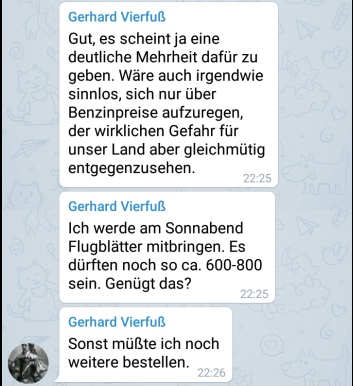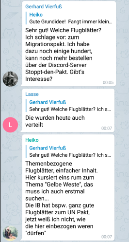 Die Gruppe hatte im Übrigens explizit kein Problem damit, mit AfD-Mitgliedern zusammenzuarbeiten und von Gerhard Vierfuß beigesteuere Flugblätter gegen den UN-Migrationspakt zu verteilen.