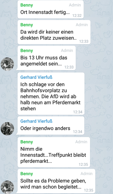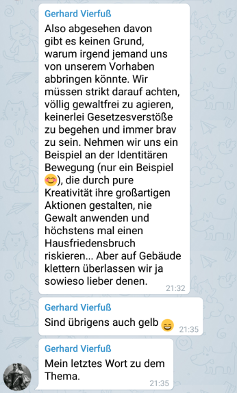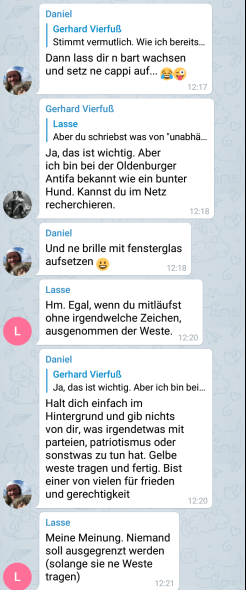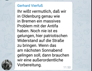 Eine rassistische Organisierung wäre keine rassistische Organisierung, wenn nicht auch die AfD in irgend einer Form mitmischen würde. So verwundert es kaum, dass der völkische Tausendsassa Gerhard Vierfuß auch an der Dezemberaktion der „gelben Westen“ teilnahm. Schon viel wurde über Vierfuß‘ Aktivitäten in der AfD, im Oldenburger Kreis sowie zu seinen Sympathien für die „Identitäre Bewegung“ und die Holocaustleugnerinnen Imke Barnstedt und Ursula Haverbeck-Wetzel geschrieben. Nun schloss sich Vierfuß also auch den „Gelbwesten“ an und beteiligte sich zeitweise auch aktiv in der „Telegram“-Gruppe. Bemerkenswert: Hierbei koordinierte er die „Gelbwesten“-Aktionen mit einem zeitgleich stattfindenden Infostand der AfD am Oldenburger Pferdemarkt. Auch berät er die Gruppe, wie sie unangemeldete Aktionen durchführen kann, ohne wegen Verstoßes gegen das Versammlungsgesetz belangt zu werden. Seine Symapthien für die völkische „Identitäre Bewegung“ kann Vierfuß auch in der Telegram-Gruppe nicht verbergen.