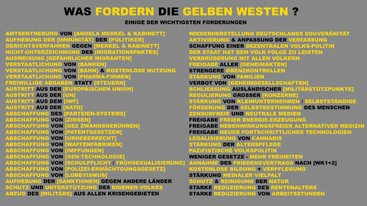 Auch inhaltlich geht es größenwahnsinnig zu. So fordert man nicht nur die Absetzung des gesamten Bundeskabinetts, die Aufhebung seiner Immunität und Gerichtsverfahren gegen alle beteiligten Politiker*innen, sondern möchte auch gleich den Austritt aus internationalen Bündnissen wie der EU, der UN oder der NATO. Und nicht nur das: Neben Zinsen, den Rundfunkgebühren, Patent- und Urheberrechtsgesetzen und Gentechnologie soll auch gleich das Parteiensystem in Gänze abgeschafft werden. Auch gegen Impfungen und die Schulpflicht spricht man sich aus.