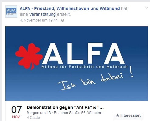 Neben mehreren antirassistischen Kundgebungen (aktuelle Infos gibt es weiterhin hier und hier) meldet sich nun auch der lokale ALFA-Ableger zu Wort. Die AfD-Abspaltung ruft am kommenden Samstag zu einer Demonstration gegen „AntiFa“ und „Wilgida“ auf. In gewohnter extremismustheoretischer Manier setzt ALFA somit rassistische, nationalistische und antisemitische Hetze mit antifaschistischem und antirassistischem Engagement gleich und verharmlost damit Propaganda und Taten der Neonazis und Rassist*innen. Die Populist*innen wollen mit der geplanten Aktion der „bürgerlichen Mitte eine Stimme“ geben, wie es im Einladungstext heißt. Bis dato ganze vier Facebookzusagen untermauern diesen Anspruch eindrücklich.