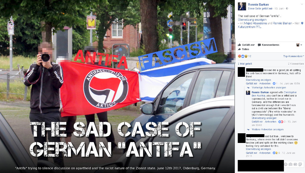 Auf seiner Facebook-Seite veröffentlichte Ronnie Barkan am darauf folgendenTag einige Fotos von den Menschen, die sich an den Protesten gegen die israelfeindliche Veranstaltung beteiligten. Ihnen unterstellte er Faschismus.