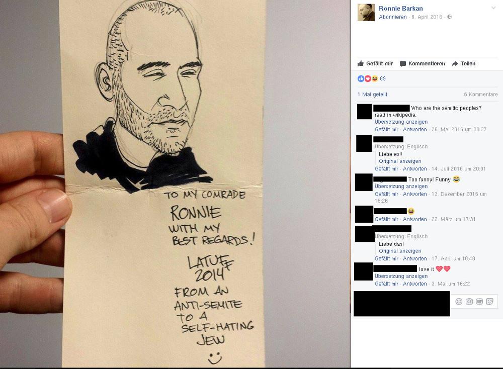 Ronnie Barkan, der zweite Referent, schmückt sein Facebook-Profil mit einem Gruß des brasilianischen Grafikers Carlos Latuff, der bei einem Holocaust-Karikaturen-Wettbewerb des iranischen Regimes 2006 den zweiten Platz errang und auch immer wieder als Zeicher für die BDS-Kampagne auftritt.