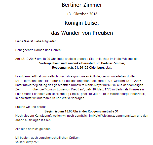 Einladung von Volker F. Felmy zu einer Veranstaltung mit der Oldenburger Holocaustleugnerin Imke Barnstedt vom Oktober 2016
