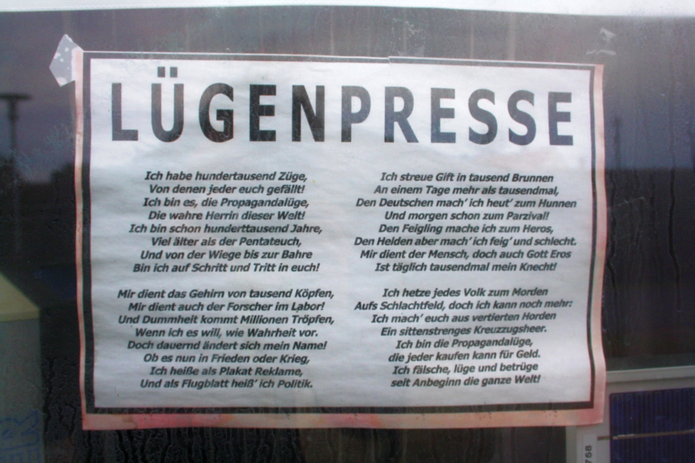 Auch hängt dieses offen antisemitische Plakat aus. Im Text wird unter anderem die antisemitische Brunnenvergiftungslegende bedient. Außerdem wird hier ein Bild gezeichnet von einer geheimen Macht, welche „fälscht, lügt und betrügt“. Zuschreibungen wie sie beispielsweise auch in NSDAP-Propaganda zu finden waren.