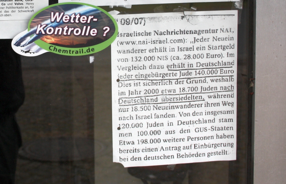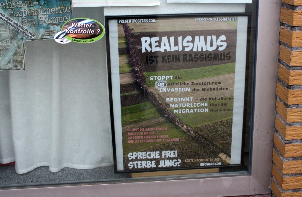 Auch in seinem Stadtteil Kreyenbrück versucht Werner Altnickel für seine kruden Theorien zu werben.So finden sich an seinem ehemaligen Ladengeschäft in der Wilhelm-Kempin-Straße, das er zu einer Festung menschenverachtender Propaganda ausgebaut hat, zahlreiche verschwörungsideologische, antisemitische und rassistische Plakate. Auch Reichsbürgerthematiken finden sich desöfteren wieder. Am Ende des Artikels dokumentieren wir einen Teil seiner Aushänge.