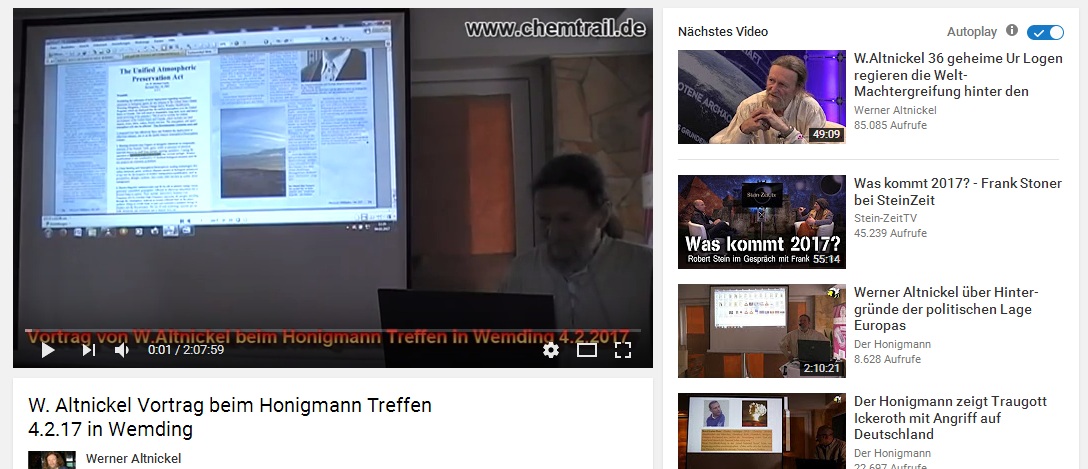 Neben dem Betreiben der bekannten verschwörungsideologischen Website „chemtrail.de“ in der er wahnhaft nach Beweisen für „Chemtrails“ sucht, veröffentlicht er dort auch andere wirre Fantasien von vermeintlichen „geheimen Ur – Logen“, welche angeblich die Welt beherrschen würden. Neben diesen „klassischen“ Verschwörungsideologien veröffentlicht das ehemalige Greenpeace-Mitglied auch offen neonazistische Inhalte auf seinem Youtube-Channel. Dieser hat über 20.000 Abonnent*innen, was in Anbetracht seiner einschläfernden Eigenproduktion „Militärische + Wirtschafts- Nachrichten“ schon ein wenig verwundert. Dort leiert Altnickel teilweise bis zu 40 Minuten monoton abgelesene Pressetexte und Zitate herunter. Ebenfalls aus seiner Eigenproduktion stammen Videos mit Namen wie „Europas Vermischung zu einer Negroid-Asiatischen Mischrasse mit IQ 90:Kalergie+Barnett“. Nicht nur mit diesem Video bewegt Werner Altnickel sich unserer Einschätzung nach im Bereich der Volksverhetzung.
